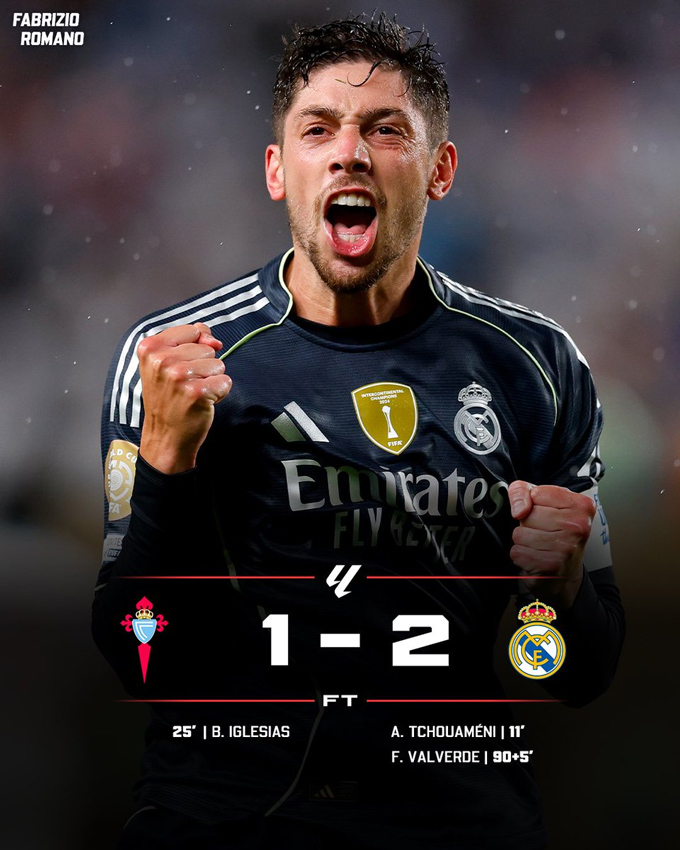 Mãi tới phút 90+4, bàn thắng thứ hai mới tới với Real. Cú sút xa của Federico Valverde đập người hậu vệ Celta Vigo đổi hướng đi vào lưới trong sự bất lực của thủ môn Radu, ấn định chiến thắng nghẹt thở 2-1 cho đội khách.