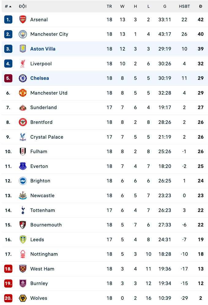 Đội hình thi đấu Chelsea vs Aston Villa