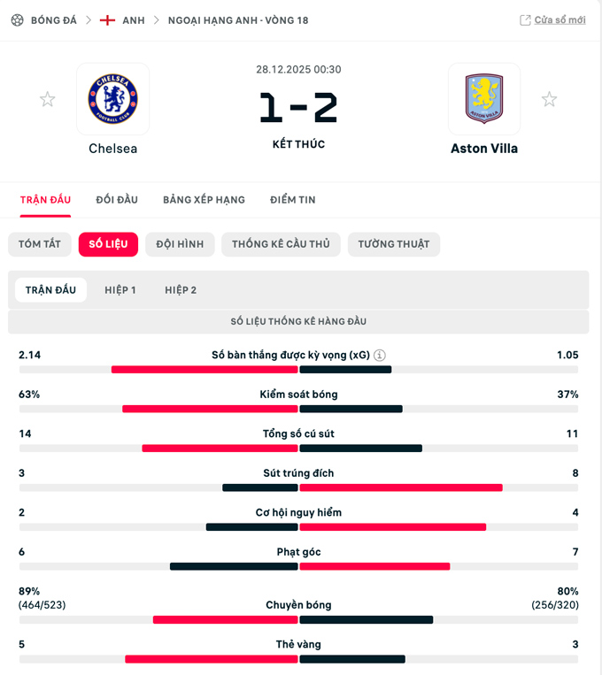 Kết quả Chelsea 1-2 Aston Villa: The Blues lâm nguy