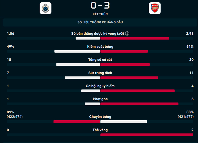 Chung cuộc, Arsenal thắng Club Brugge 3-0 và duy trì vị trí số 1 trên BXH Champions League. Họ trở thành đội bóng Anh thứ năm trong lịch sử thắng cả 6 trận mở màn một mùa giải Cúp C1/Champions League, sau MU, Leeds, Liverpool và Man City.