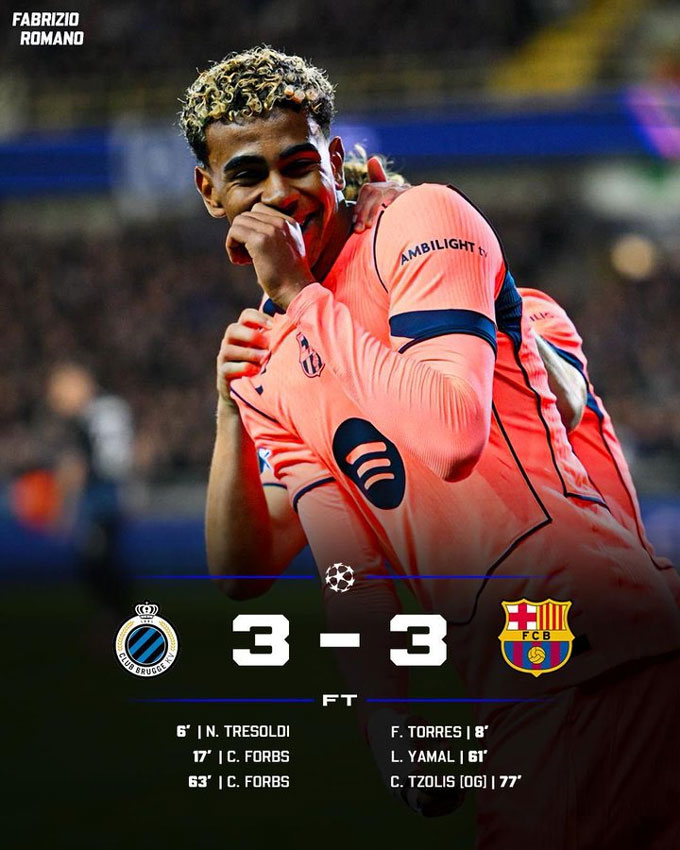 Trận đấu khép lại với tỉ số hòa 3-3. Barca bỏ lỡ cơ hội bứt phá trên bảng xếp hạng khi chỉ đứng thứ 11 với 7 điểm, còn Club Brugge xếp thứ 22 với 4 điểm sau 4 lượt trận.