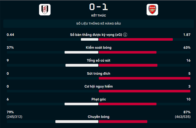 Dẫu vậy, bàn thắng của Trossard là đủ để đoàn quân của HLV Mikel Arteta rời Craven Cottage với trọn vẹn 3 điểm. Bộ đôi trung vệ Gabriel và Saliba tiếp tục thi đấu chắc chắn, giúp Arsenal giữ trận sạch lưới thứ 5 kể từ đầu mùa..