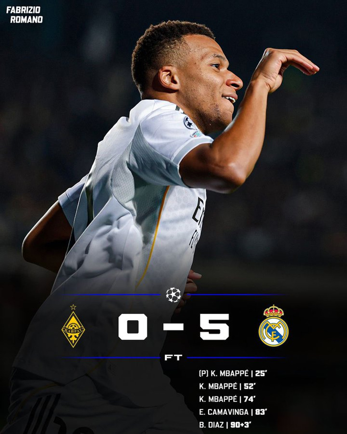 Real Madrid: Mbappe (25'-pen, 52', 73'), Camavinga (83'), Brahim Diaz (90+3')