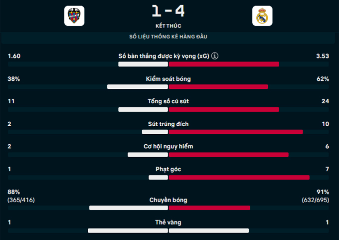 Dẫu vậy, đây là tất cả những gì Levante làm được ở trận này. Đến phút 64, Mbappe ghi bàn để tái lập cách biệt 2 bàn cho Real Madrid sau pha đá 11m thành công. Trước đó, chính tiền đạo người Pháp kiếm về phạt đền khi anh bị Elgezabal phạm lỗi trong vòng cấm.