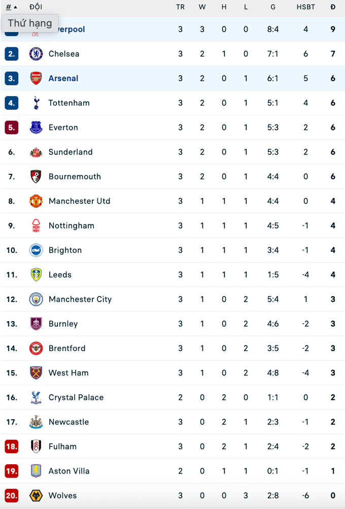 | TT | Đội bóng | Trận | +/- | Điểm |