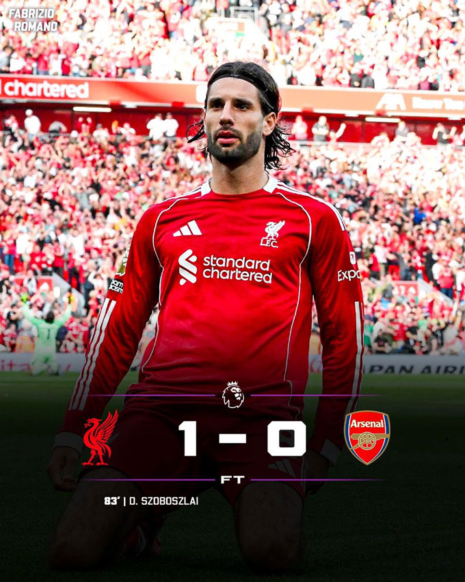 Những tưởng trận đấu sẽ kết thúc với tỷ số hoà thì bất ngờ đã xảy ra. Phút 83, Szoboszlai thực hiện quả đá phạt hoàn hảo đưa bóng chạm mép dưới xà ngang bay thẳng vào lưới. 1-0 cho Liverpool.