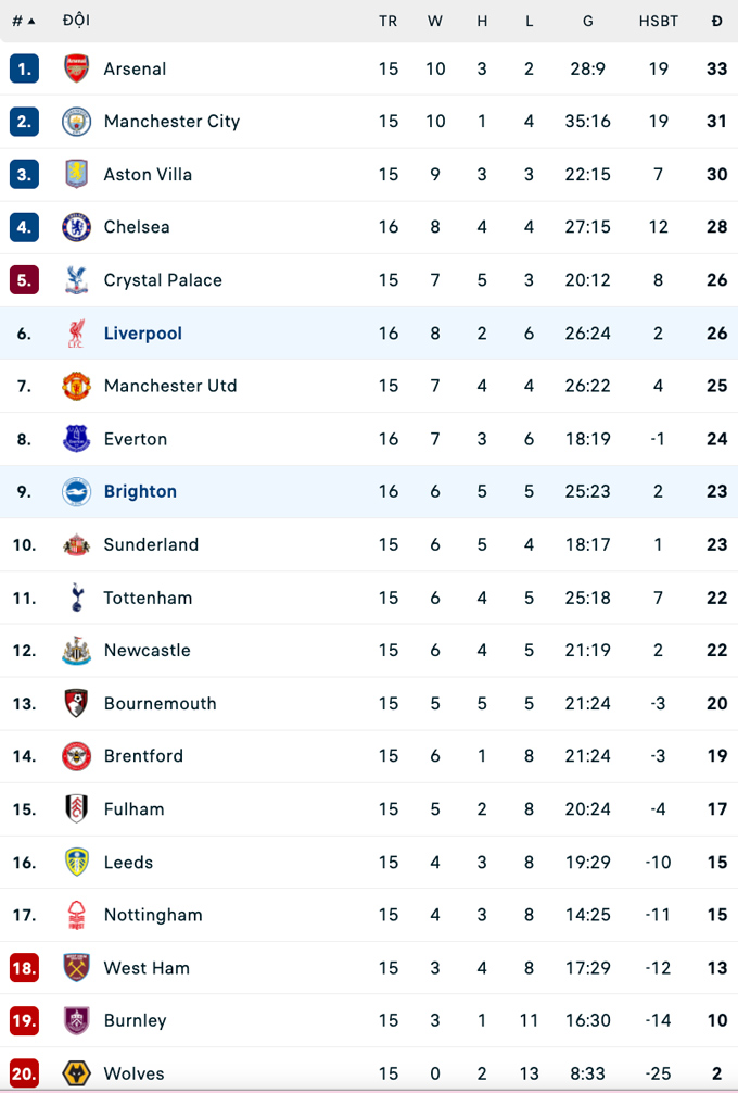 | TT | Đội bóng | Trận | +/- | Điểm |