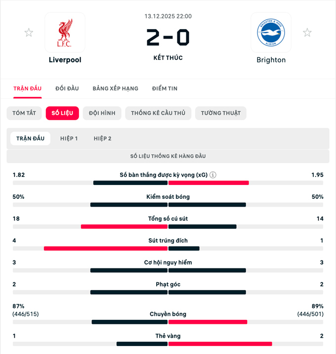 Đội hình thi đấu Liverpool vs Brighton