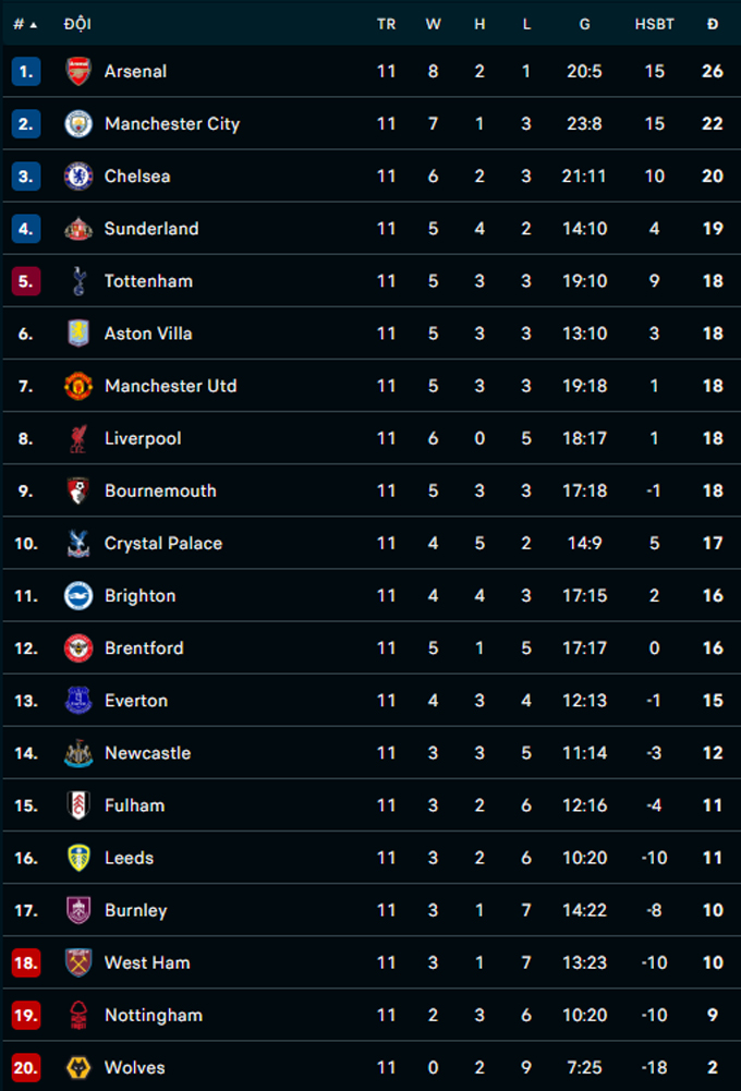 | TT | Đội bóng | Trận | +/- | Điểm |