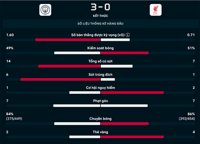 Thắng đậm 3-0, dàn sao Man City coi như đã "tặng quà" nhân kỷ niệm trận thứ 1.000 trong sự nghiệp cầm quân của Guardiola. Ngoài ra, Man City trở lại vị trí nhì bảng và thu ngắn cách biệt còn 4 điểm so với Arsenal còn Liverpool tụt xuống vị trí thứ 8.