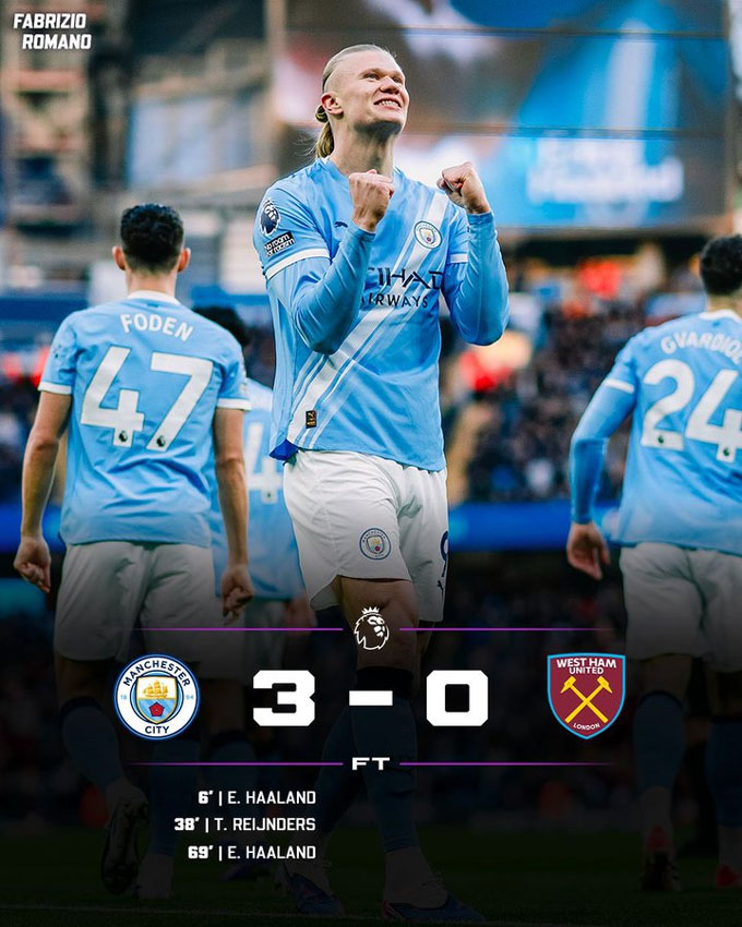 Không những vậy, West Ham còn bị thủng lưới thêm. Phút 69, tận dụng sự lúng túng của các hậu vệ West Ham trong việc phá bóng, Haaland dễ dàng tung ra cú dứt điểm cận thành để hoàn tất cú đúp của bản thân trong trận đấu này.
