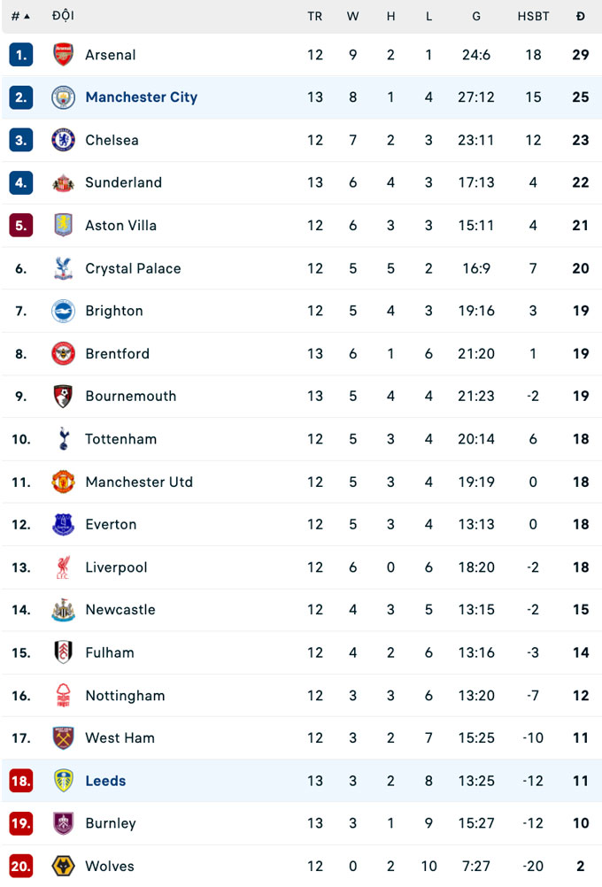 | TT | Đội bóng | Trận | +/- | Điểm |