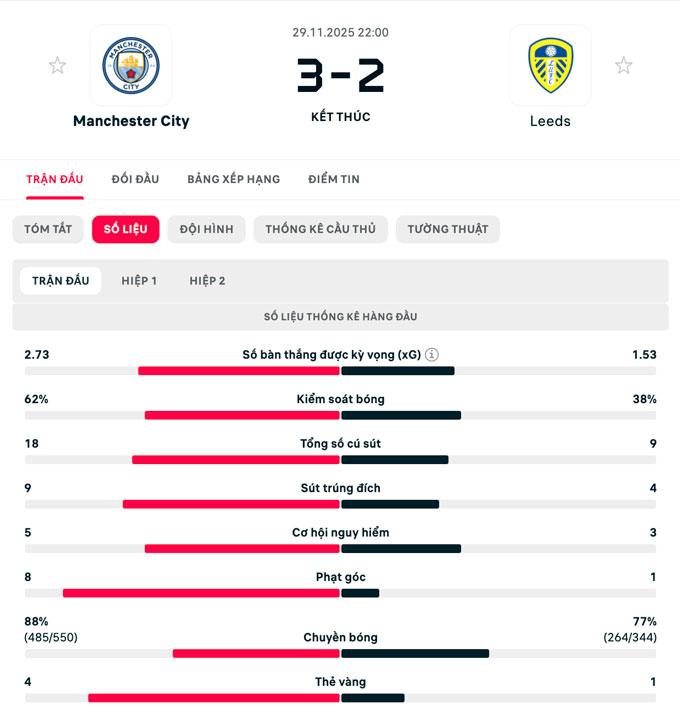 Kết quả Man City 3-2 Leeds: Man xanh thắng nhọc đòi lại ngôi nhì bảng