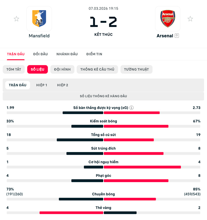 Kết quả Mansfield 1-2 Arsenal: Pháo thủ nhọc nhằn vào tứ kết FA Cup