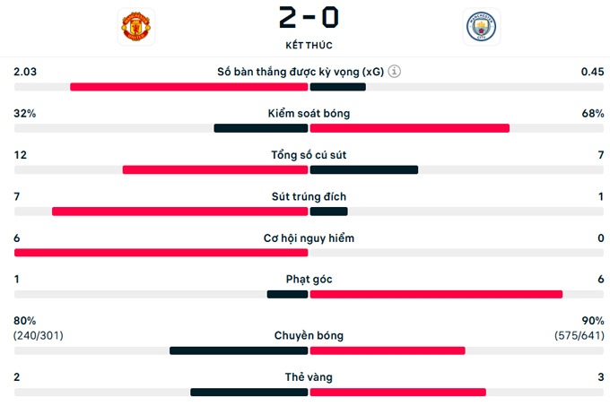 Chung cuộc, MU xử đẹp Man City 2-0 trên sân nhà Old Trafford trong trận ra mắt của tân HLV tạm quyền Carrick. Chiến thắng này giúp MU tạm thời vào Top 4 với 35 điểm sau 22 vòng đấu.