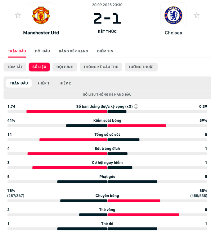 Trận đấu khép lại với tỷ số 2-1 nghiêng về phía MU. Dù chật vật nhưng MU cũng đã có được 3 điểm và leo lên vị trí thứ 9 trên BXH. Trong khi đó, Chelsea tụt xuống thứ 6 với chỉ 1 điểm nhiều hơn MU.
