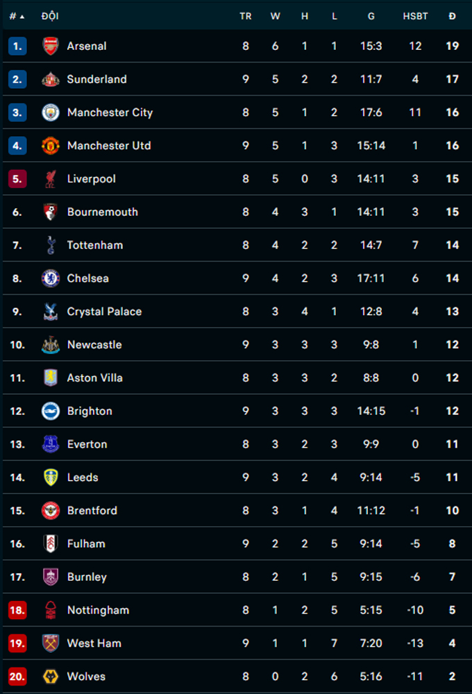 | TT | Đội bóng | Trận | +/- | Điểm |