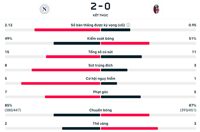 Phút 38, ngôi sao 28 tuổi người Brazil, David Neres, tung cú sửa lòng bằng chân trái từ ngoài vòng cấm tung lưới Bologna mở tỷ số cho Napoli. Một siêu phẩm của cựu tiền đạo Ajax.