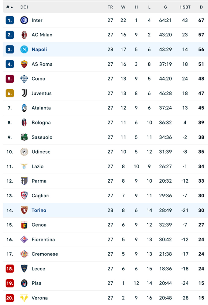 | Serie A - Vòng 28 | |||