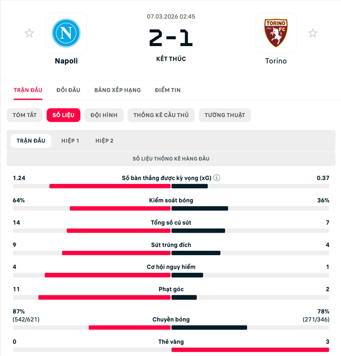 Tuy nhiên, thời gian còn lại là không đủ để đội khách tạo nên cuộc lội ngược dòng. Napoli thi đấu chắc chắn trong những phút cuối để bảo toàn chiến thắng chung cuộc 2-1.