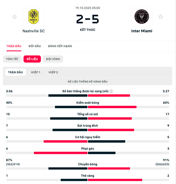 Tuy nhiên, lợi thế của Inter Miami không kéo dài lâu. Phút 43, Sam Surridge đánh đầu cận thành sau quả tạt chính xác của Hany Mukhtar, gỡ hòa 1-1 cho Nashville. Trong những phút bù giờ của hiệp một, Nashville tổ chức phản công nhanh, và Jacob Shaffelburg dứt điểm cận thành bằng chân trái, giúp đội chủ nhà vươn lên dẫn 2-1.
