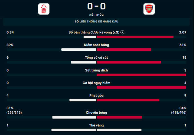 Ở chiều ngược lại, Nottingham Forest gặp nhiều khó khăn trong việc tạo ra cơ hội, khi tiền đạo Igor Jesus tỏ ra khá đơn độc trên hàng công. Dù vậy, sự kỷ luật và chắc chắn trong phòng ngự đã giúp Nottingham Forest giữ sạch lưới, qua đó giành được 1 điểm vô cùng quý giá trong cuộc chiến trụ lại Ngoại hạng Anh.