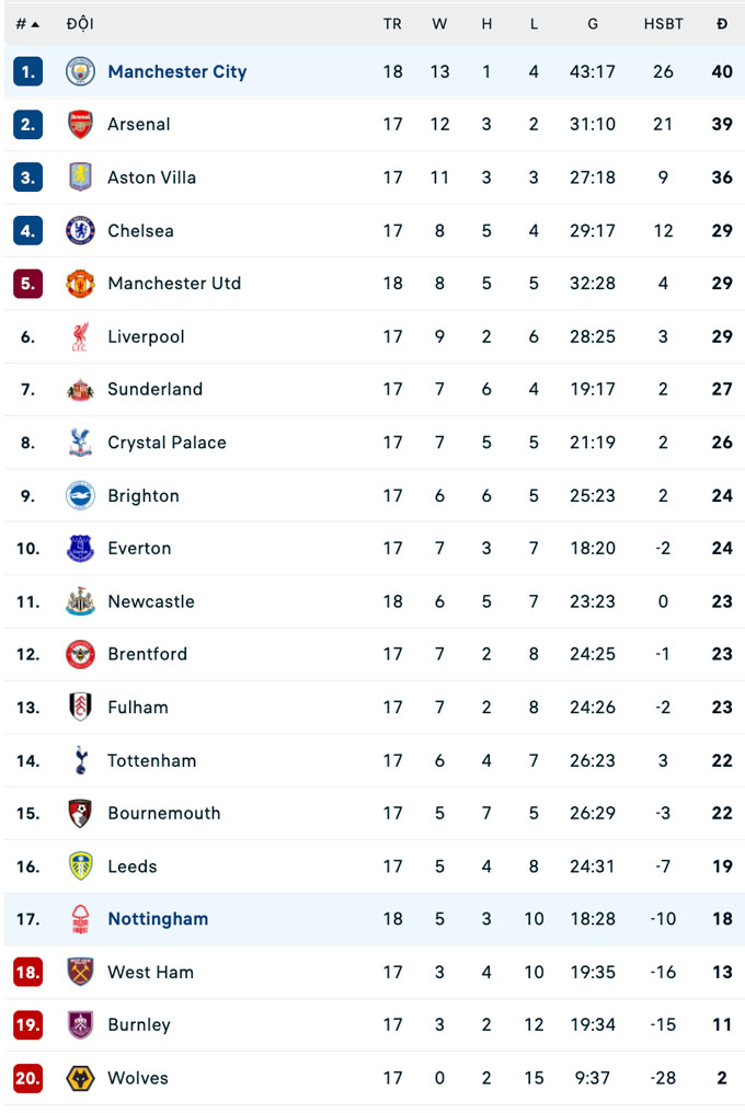 | TT | Đội bóng | Trận | +/- | Điểm |