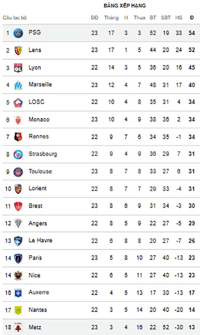 Do ở trận đấu sớm Lens bất ngờ thất thủ 2-3 ngay trên sân nhà dưới tay Monaco, thắng lợi tưng bừng của PSG trước Metz đã giúp đội bóng của HLV Luis Enrique đòi lại được ngôi đầu BXH. Sau 23 vòng, trong khi Lens vẫn có 52 điểm thì PSG đã vượt lên trên họ với 2 điểm nhiều hơn.
