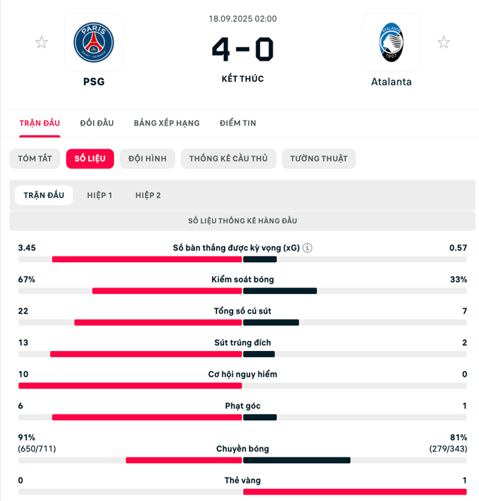 Đại thắng Atalanta ngày ra quân, PSG chiễm chệ trên ngôi đầu trong khi đội bóng của Italia ngậm ngùi đứng ở cuối BXH.