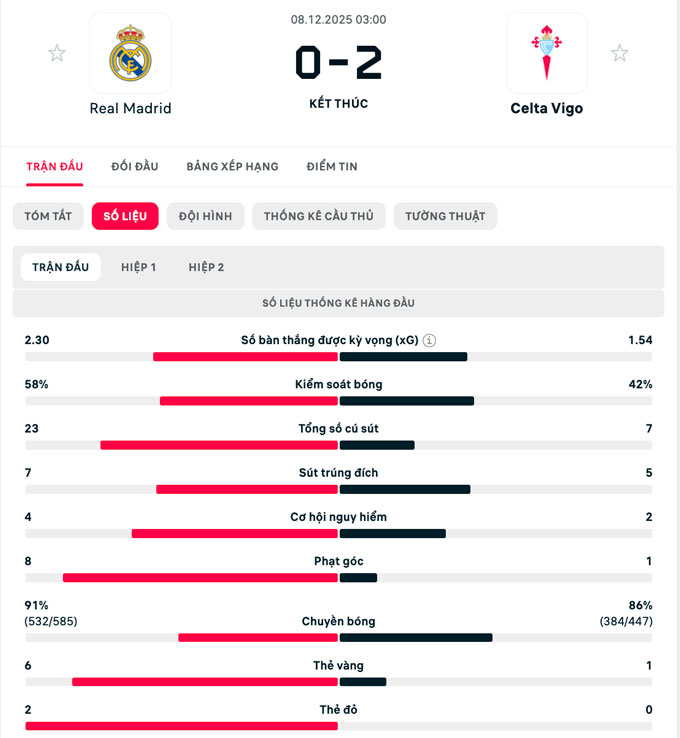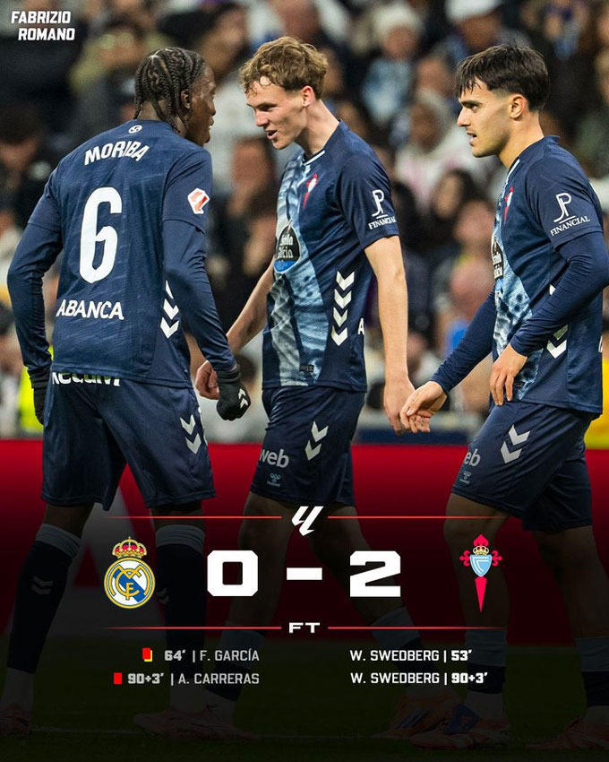 Thất bại chung cuộc 0-2 trước Celta khiến Real Madrid bị đại kình địch Barca nới rộng khoảng cách lên 4 điểm trong cuộc đua tới ngôi vương La Liga mùa này.