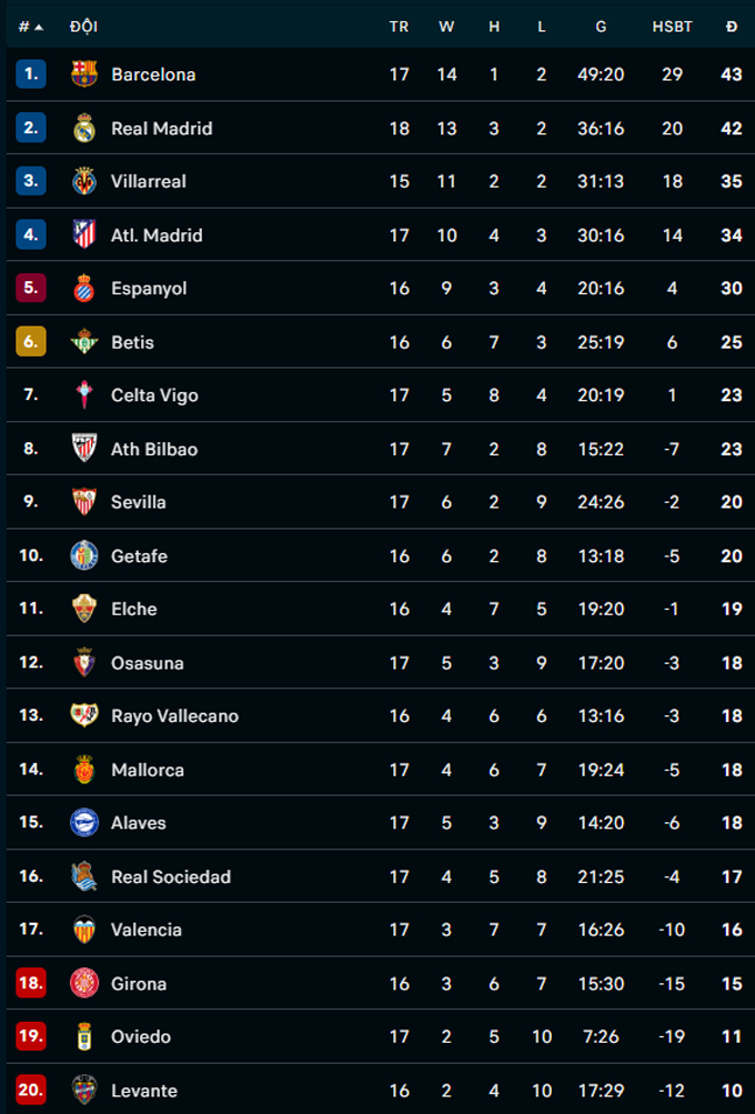 | TT | Đội bóng | Trận | +/- | Điểm |