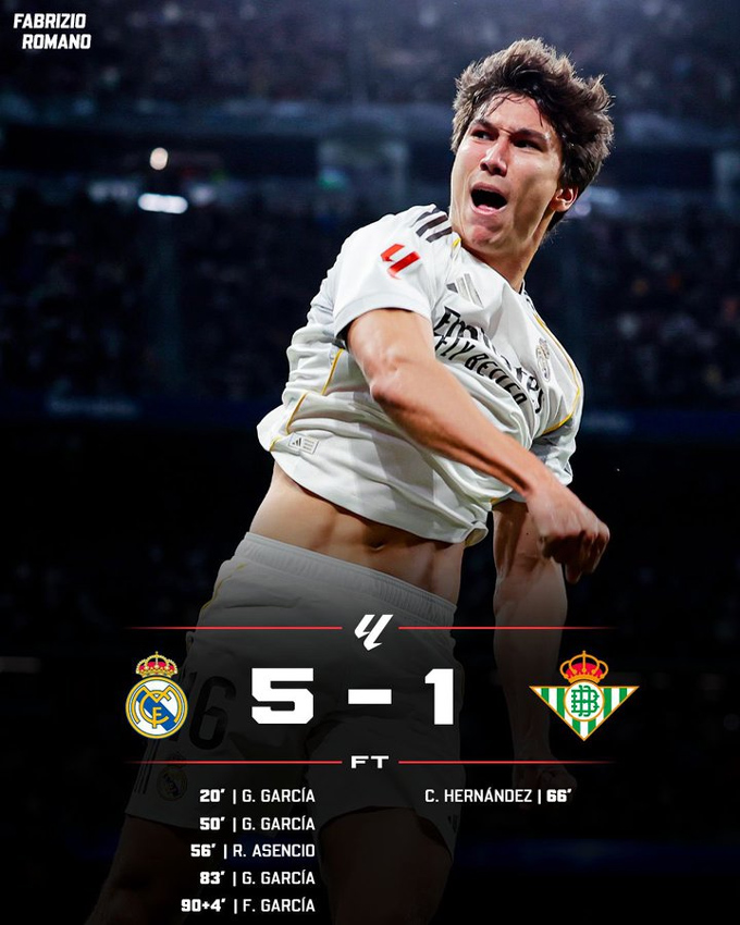 Kết quả Real Madrid 5-1 Real Betis: Siêu nhân Gonzalo Garcia