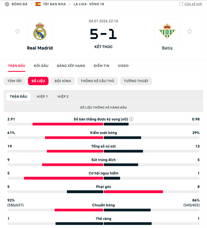 Tới phút 90+3, cầu thủ vào sân thay người Fran Garcia ghi bàn ấn định tỷ số 5-1 cho Real Madrid. Chiến thắng thuyết phục này giúp Los Blancos thu hẹp cách biệt với đội đầu bảng Barca xuống còn 4 điểm.