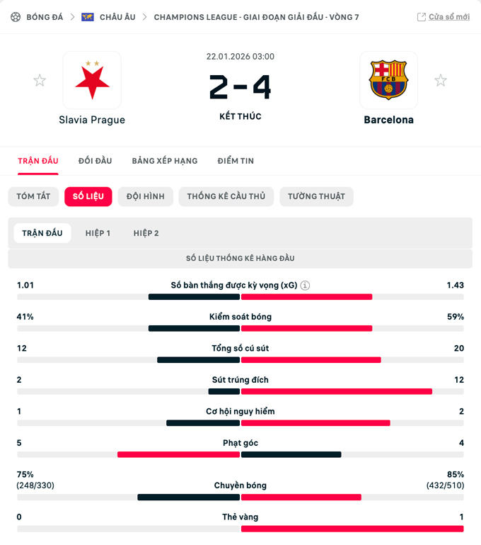 Vượt qua Slavia Praha trong trận cầu tưng bừng bàn thắng, Barca đã leo lên vị trí thứ 9 trên BXH và có khả năng lớn có thể lọt vào top 8 đội đầu tiên để giành vé vào thẳng vòng 1/8.