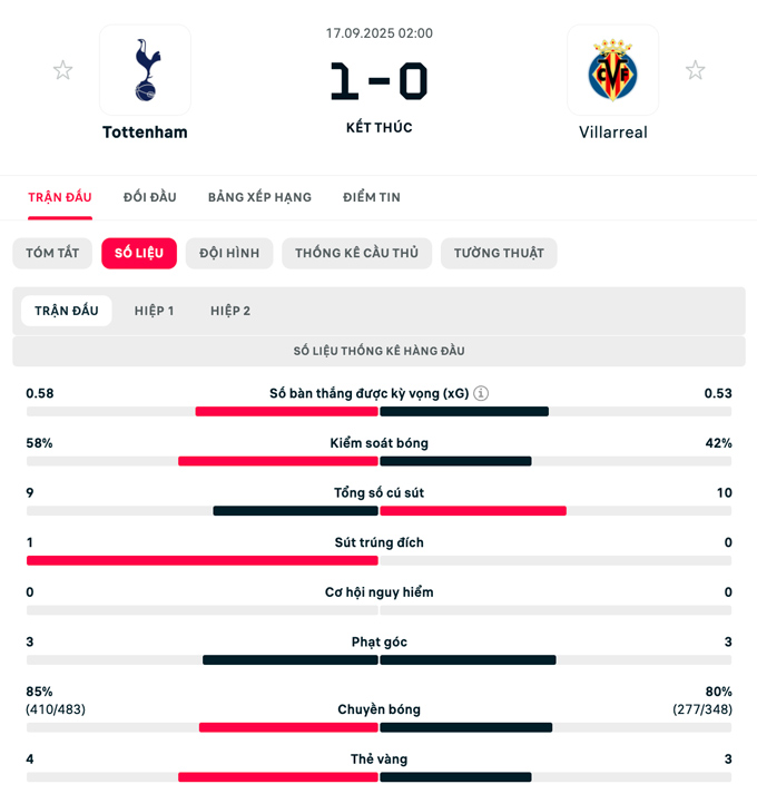Spurs khép lại trận mở màn vòng phân hạng Champions League 2025/26 bằng chiến thắng quan trọng 1-0, tạm thời chiếm vị trí thứ 5 trên BXH. Trong khi đó, Villarreal tạm đứng thứ 34/36 đội.