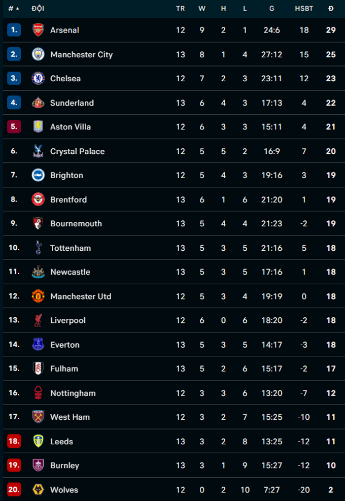| TT | Đội bóng | Trận | +/- | Điểm |