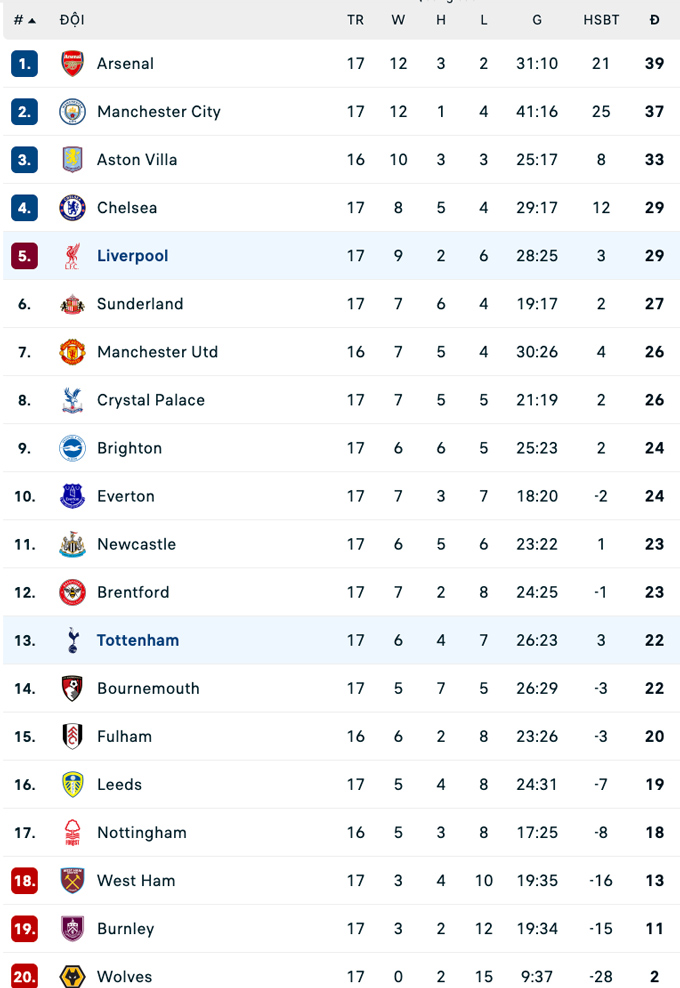 Chung cuộc, Liverpool giành chiến thắng với tỷ số 2-1 và leo lên vị trí thứ 5 trên BXH. Họ bằng điểm với Chelsea nhưng xếp dưới do kém hơn về hiệu số. Trong khi đó, Tottenham đứng thứ 13.