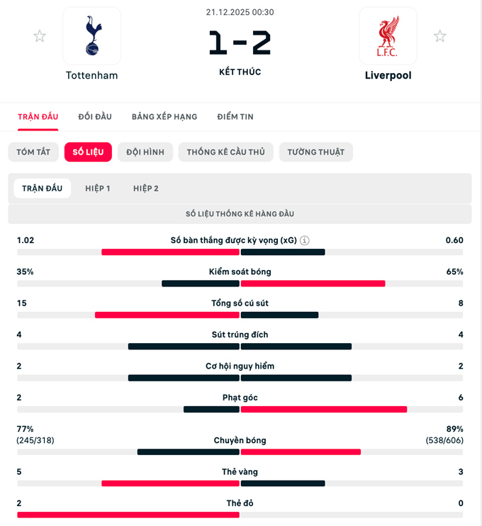 Thẻ đỏ Tottenham vs Liverpool