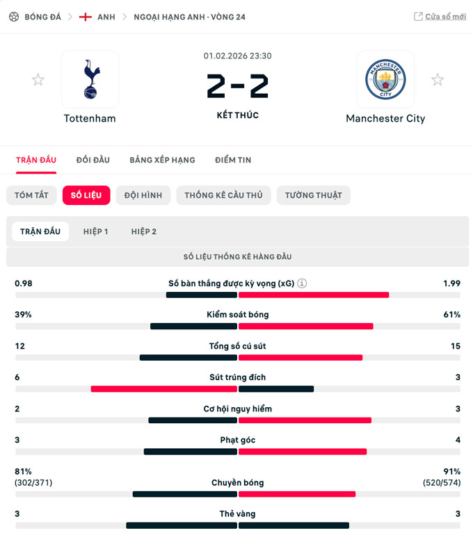 Dù thời gian còn lại là khá nhiều nhưng cả Tottenham và Man City đều không thể có thêm bàn thắng. Chung cuộc, hai đội hòa 2-2 và Man xanh hiện đã bị Arsenal bỏ xa tới 6 điểm.