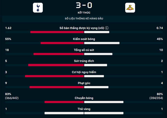 Chỉ ba phút sau, Tottenham có bàn thứ hai. Wilson Odobert đột phá bên cánh trái rồi căng ngang vào vòng cấm, khiến hậu vệ McGrath lóng ngóng đá phản lưới nhà. 2-0 cho Tottenham