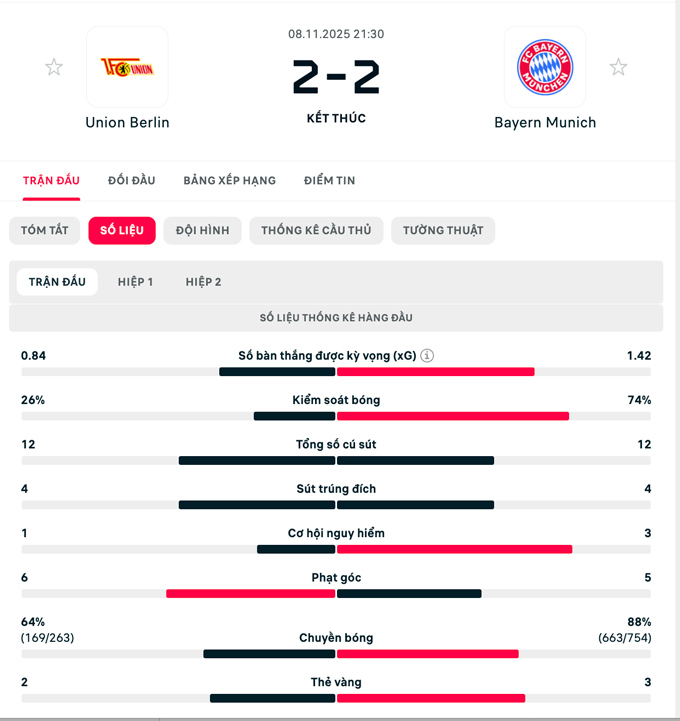 Kết quả Union Berlin 2-2 Bayern: Hùm xám đứt mạch toàn thắng