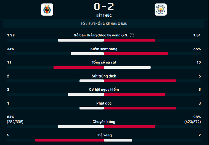 Trận đấu khép lại với tình huống Oluwaseyi bên phía Villarreal đánh đầu đưa bóng đi trúng cột dọc khung thành Man City. Chung cuộc, thầy trò Pep Guardiola giành chiến thắng 2-0 để có mặt trong top 5 vòng phân hạng Champions League 2025/26.