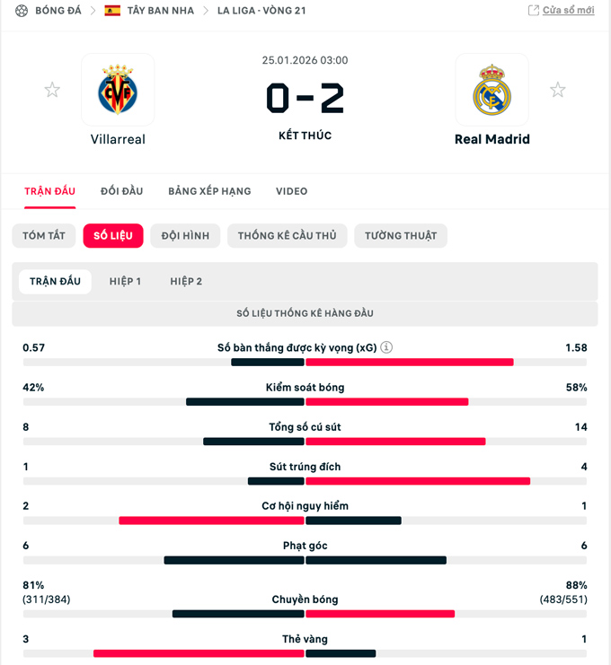 Sau khi có được bàn thắng, Real chủ động giảm nhịp độ trận đấu. Họ thi đấu cầm chừng để giữ sức cho trận đấu tại Champions League vào giữa tuần tới. Chính vì thế, Villlareal có cơ hội cực tốt để gỡ hòa nhưng Gerard Moreno lại dứt điểm quá tệ trong tư thế không bị ai kèm.