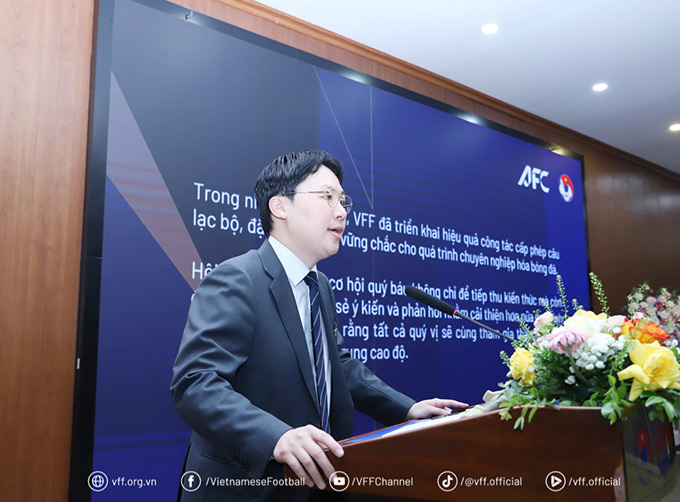 Trong khi đó, ông Doojin Sa – Trưởng phòng Bóng đá chuyên nghiệp AFC chia sẻ: “Những năm qua, LĐBĐVN đã triển khai hiệu quả công tác cấp phép câu lạc bộ, đặt nền móng vững chắc cho quá trình chuyên nghiệp hóa bóng đá. Hội thảo lần này là cơ hội để tiếp thu kiến thức cũng như các đại biểu chia sẻ ý kiến, phản hồi nhằm cải thiện hơn nữa quy trình cấp phép. Tôi mong rằng tất cả sẽ quý vị sẽ cùng tham gia thảo luận một cách tích cực và tập trung cao độ”.