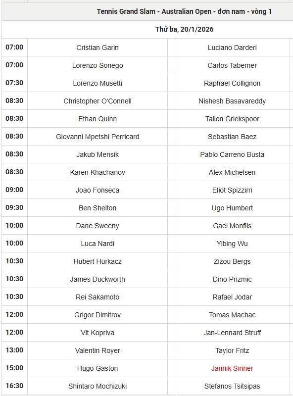 Lịch thi đấu Australian Open 2026 ngày 3: Đương kim vô địch Jannik Sinner ra quân