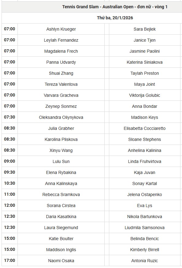 Buổi chiều, Belinda Bencic đứng trước thử thách khó chịu mang tên Katie Boulter, song kinh nghiệm và bản lĩnh thi đấu đỉnh cao có thể là chìa khóa giúp tay vợt Thụy Sĩ giành quyền đi tiếp. Khép lại ngày thi đấu, Naomi Osaka là cái tên được chờ đợi nhất, với cơ hội lớn giành chiến thắng thuyết phục trước Antonia Ruzic để tiếp tục hành trình tìm lại ánh hào quang tại Melbourne.