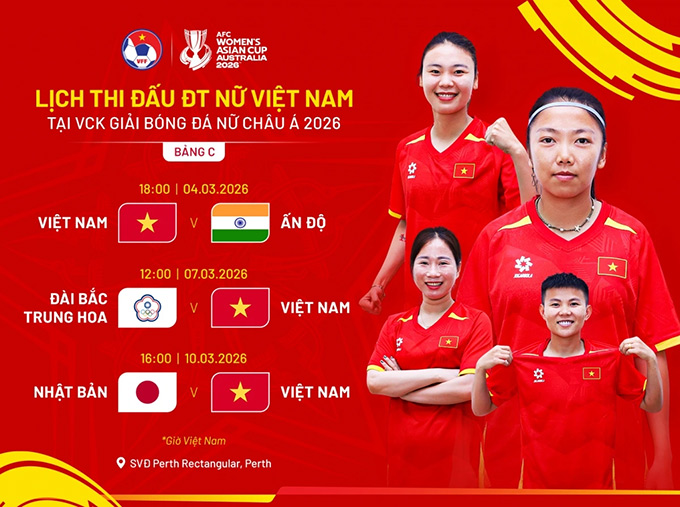 VCK Asian Cup nữ 2026 diễn ra từ ngày 1/3 đến 21/3/2026 tại ba thành phố Sydney, Perth và Gold Coast của Australia. ĐT nữ Việt Nam dưới sự dẫn dắt của HLV Mai Đức Chung sẽ mở màn bảng C bằng cuộc chạm trán Ấn Độ vào ngày 4/3. Hai lượt đấu tiếp theo gặp Đài Bắc Trung Hoa và Nhật Bản lần lượt diễn ra vào các ngày 7/3 và 10/3, toàn bộ đều tổ chức trên sân Perth Rectangular.