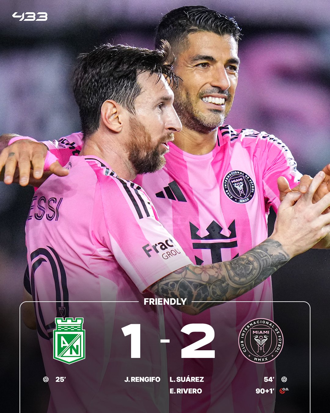 Phút 46, tận dụng sai lầm từ đường chuyền hỏng của thủ môn đối phương, Rodrigo De Paul cướp bóng và kiến tạo cho Messi. Cú sút của Messi trúng cột dọc nảy ra nhưng là vừa tầm để Suarez đệm bóng cận thành san bằng cách biệt. Đây cũng là bàn thắng đầu tiên của Inter Miami trong giai đoạn tiền mùa giải năm nay.