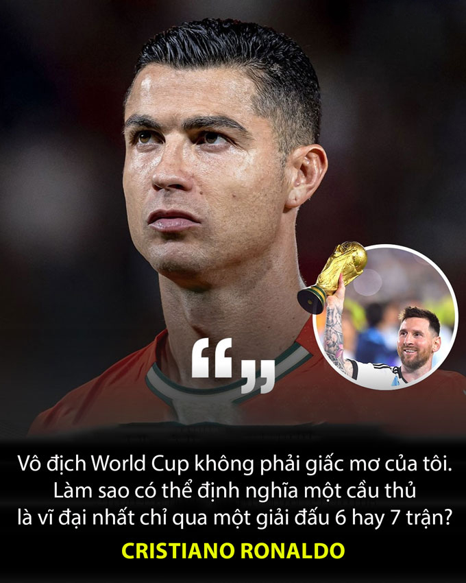 Trong cuộc phỏng vấn với chương trình Piers Morgan Uncensored, Ronaldo nói: “Nếu anh hỏi tôi, Cristiano, giấc mơ của anh có phải là vô địch World Cup không? Không, đó không phải là giấc mơ. Làm sao có thể định nghĩa một cầu thủ là vĩ đại nhất chỉ qua một giải đấu 6 hay 7 trận? Anh nghĩ như vậy có công bằng không?”.