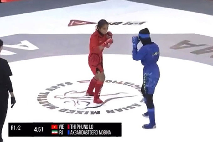 Sau khi né thành công một đòn đá của đối phương, Lò Thị Phung lập tức lao vào ôm người, quật ngã võ sĩ Iran xuống sàn, đưa trận đấu vào thế địa chiến. Mobina phản kháng quyết liệt, lật ngược thế trận để chiếm vị trí trên. Tuy nhiên, trong tình huống tưởng như bất lợi, nữ võ sĩ Việt Nam đã tung ra “tuyệt chiêu” sở trường: khóa tam giác bằng hai chân, siết chặt cổ đối thủ.